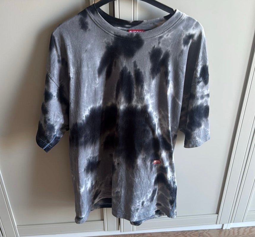 Gri batik desenli, kısa kollu, yuvarlak yaka, bol kesim tişört. 1-2 defa giyildi küçük geldiği için satıyorum