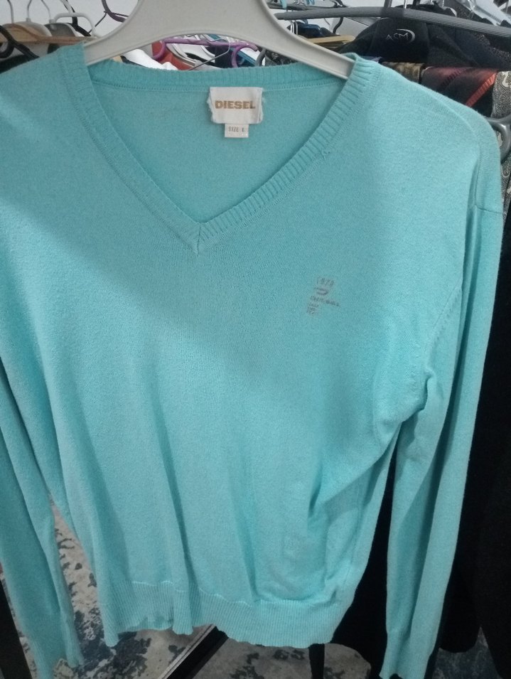 Diesel markalı, turkuaz renkte, V yaka ve uzun kollu erkek kazak. Örgü dokulu, yumuşak kumaştan, salaş ve midi boyda. Günlük rahat ve pastel tonlarda.
