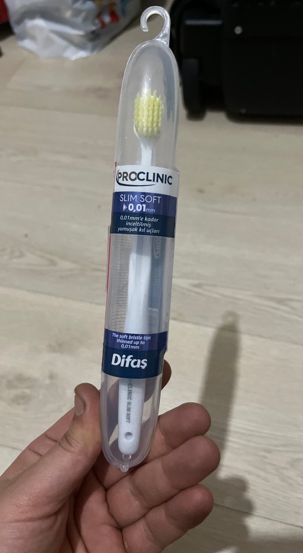 Difas Proclinic diş fırçası, 0.01 mm incelikte yumuşak kıllara sahiptir ve şeffaf koruyucu kutuda sunulur.