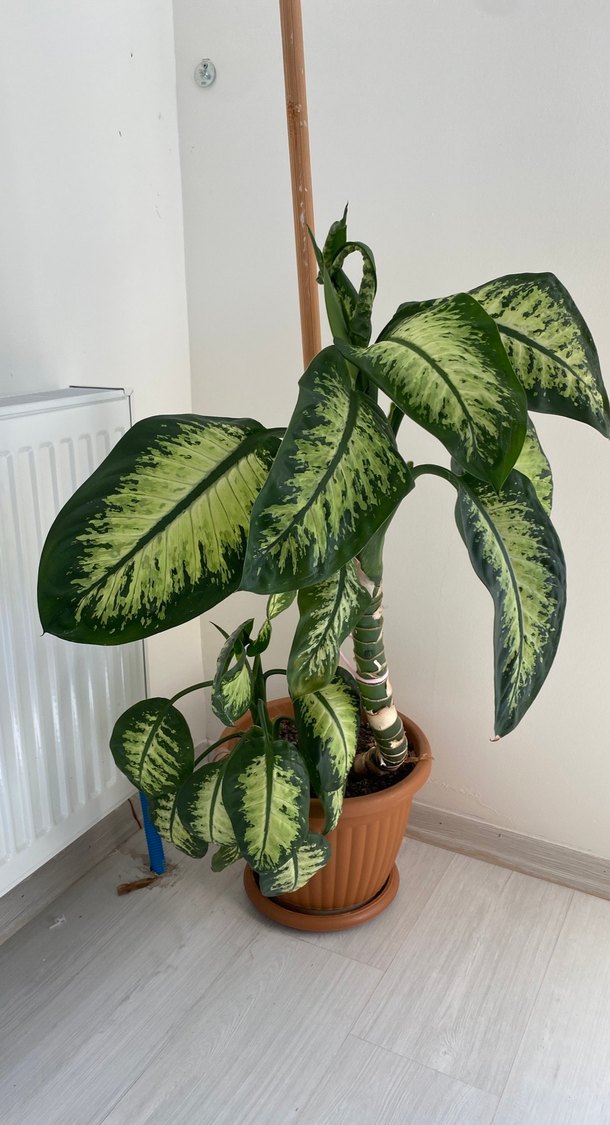 Salonların en göz alıcı çiçeği difenbahya . İki köklüdür dibinden sitil çıkmıştır 2 si aynı saksı içinde gönderim yapılacaktır. Büyük, desenli yeşil yapraklara sahip dekoratif ev bitkisi, kahverengi saksıda, mekâna doğal bir hava katıyor.