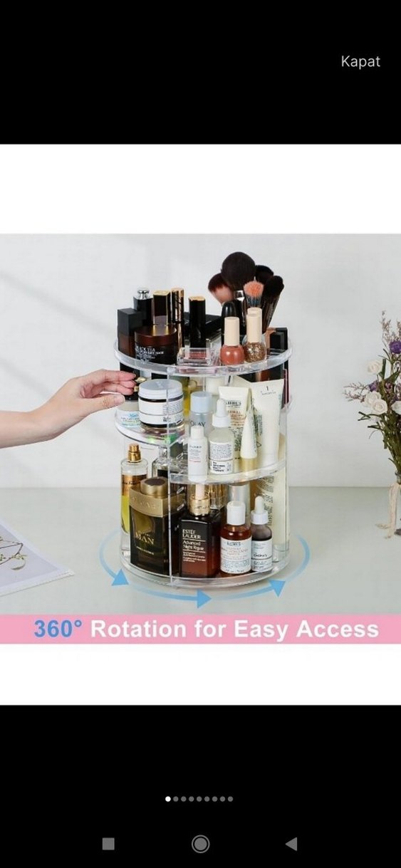 Bej renkli, 360° dönebilen makyaj organizeri, kozmetik ve cilt bakım ürünlerine kolay erişim sağlar. Açık renk ve geniş tasarım.