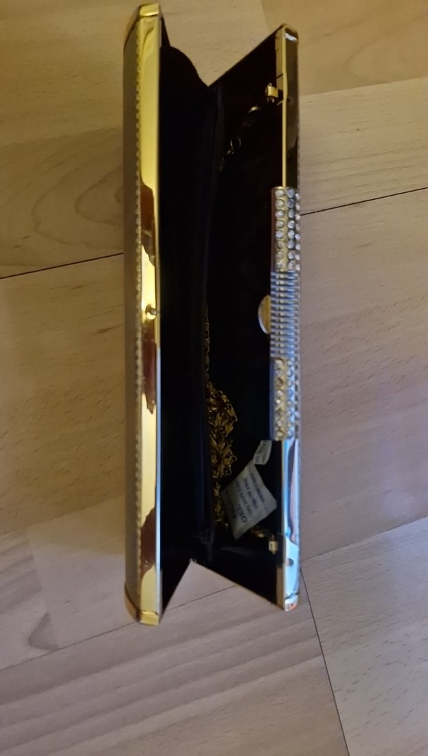 Diger markasının parlak altın renginde, yılan desenli ve zincir detaylı metal abiye çantası, düğün ve klasik vintage tarz için uygundur.