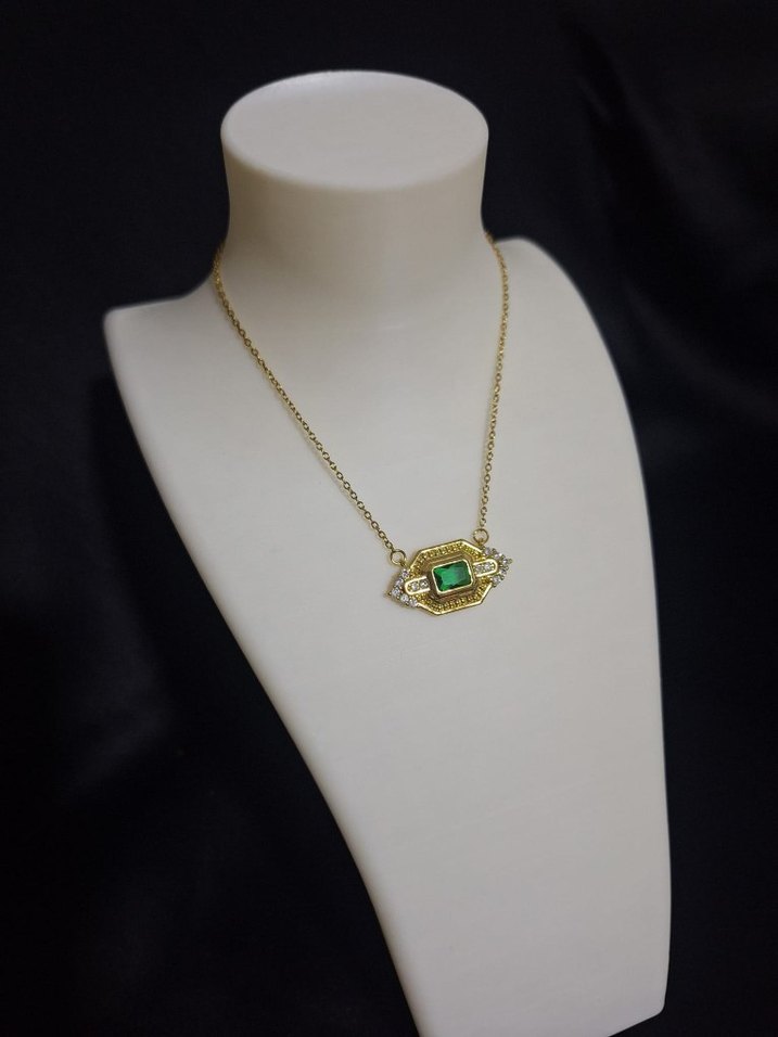 Diger markasının kısa altın zincirli kolyesi, renkli yılan deseni ve yeşil taş detaylı vintage tarzıyla romantik akşamlar için ideal.