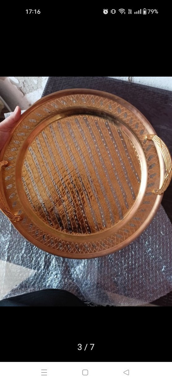 Diger markasına ait, parlak altın renkli, yılan desenli klasik tarzda kulplu tepsi.