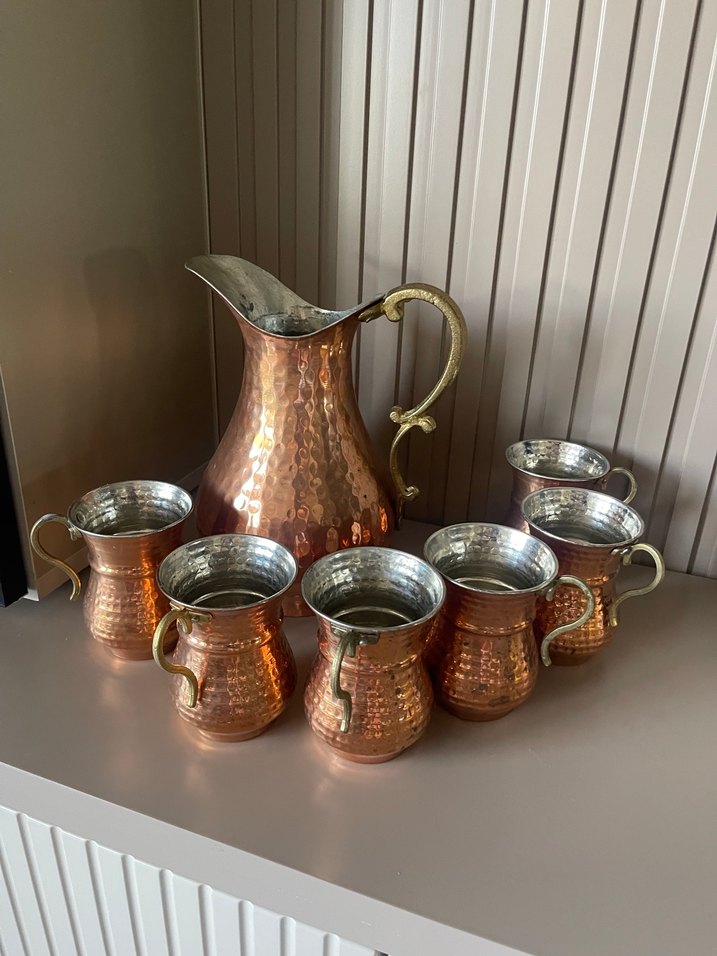 Diger markasına ait, parlak bakır sürahi ve işlemeli saplı 6 adet bakır bardak seti.