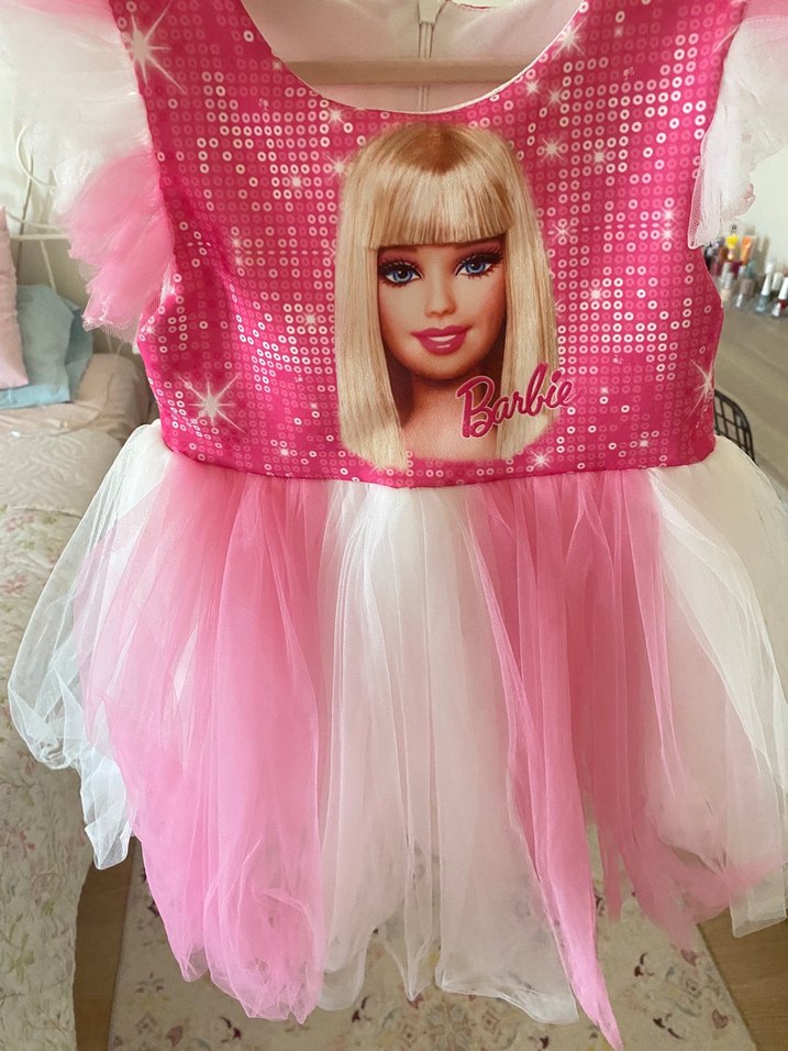 Diger markalı Barbie baskılı, pembe renkli kız çocuk elbisesi, yumuşak katmanlı tül etek detayına sahiptir.