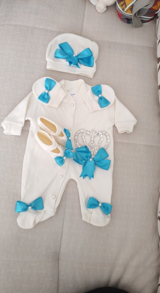 Beyaz bebek hastane kıyafeti( 0 - 3 aylık.) gümüş ve mavi fiyonklarla süslenmiştir. Yumuşak ve sıcak kumaştan yapılmış, şapka ellik ve patiğiyle tamamlanmıştır. Yiğenime yaptırmıştım. Fakat biraz toplu dogunca bunu giymeden küçüldü.. Hiç giyilmedi. Sıfır.