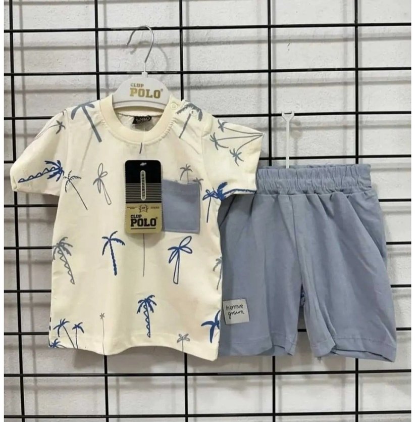 Diger markalı bebek erkek takımı, kısa kollu, bisiklet yaka pamuklu üstü pastel tonlarda palmiye baskılı ve cep detaylı, yanında yumuşak mavi şort bulunur.