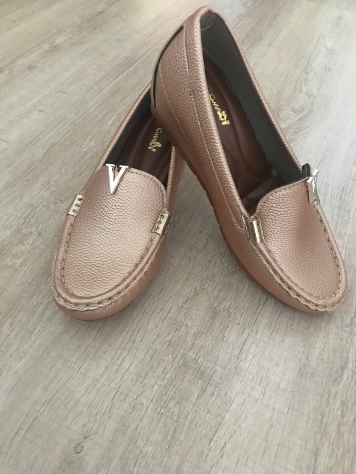 Bambi markasına ait bej renkli deri babetler, dolgu topuk ve tokalı detaylarla klasik ve parlak bir görünüm sunar, günlük kullanım için uygundur. Daha önce kullanılmadı. Topuk boyu 5 cm.