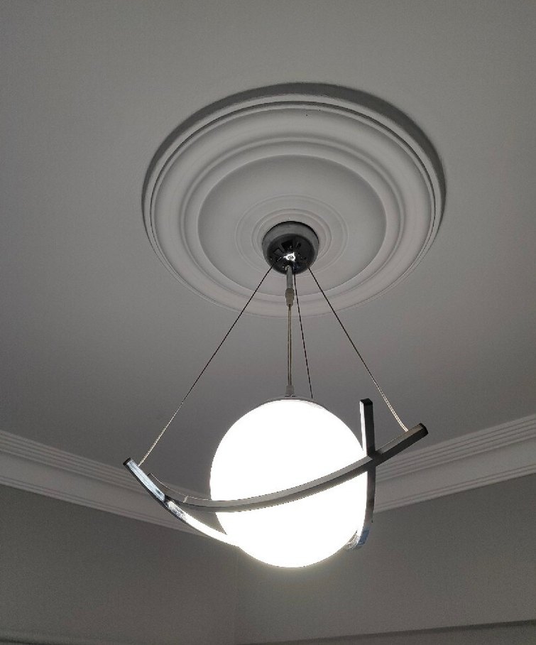 Diger markalı bu avize, bej ve gri renklerde modern kavisli bir çerçeve ve parlak küresel bir ışık içerir. Tavandan şık şekilde sarkar.