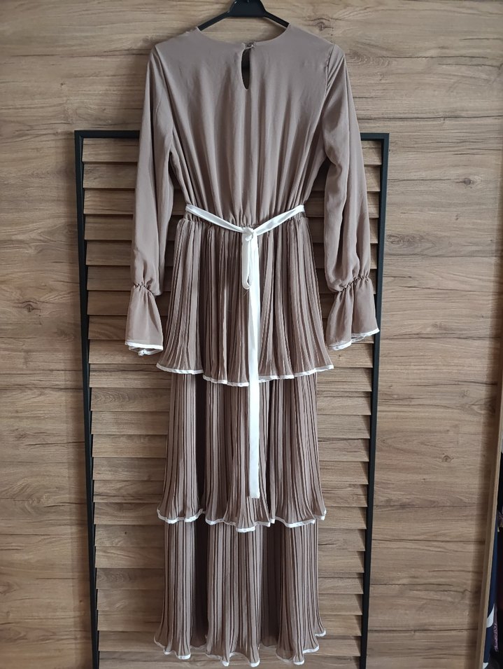 Diger markanın bej rengi uzun elbisesi pilili katmanlara ve regular kesime sahiptir.uzun kollu ve bisiklet yaka detaylıdır. beyaz kemerle tamamlanmıştır. 40 beden sadece 2 kez giyildi