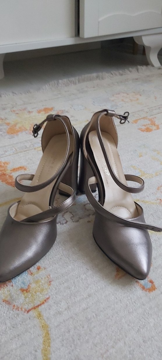Diger markalı, bej renkte, tokalı kayışlı yüksek topuklu kadın ayakkabısı. Modern klasik tarzda, düğün için uygun, lastik malzemeden üretilmiştir.
