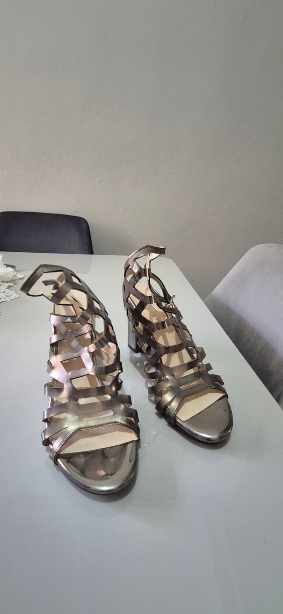 Diger markanın metalik görünümlü, tokalı ve yılan derisi desenli bej blok topuklu kadın ayakkabısı, modern ve şık tasarıma sahiptir.