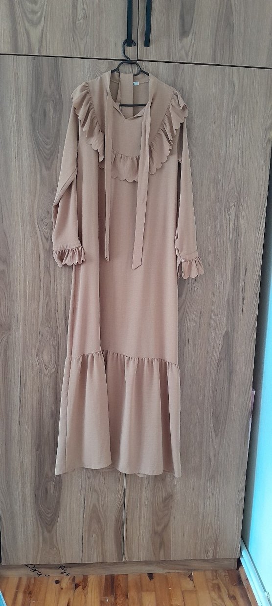 bej uzun keten elbise, bol kesim ve uzun kolludur. Yumuşak kumaştan, fırfır detaylı bohem ve sade tarzda, günlük kullanıma uygundur.