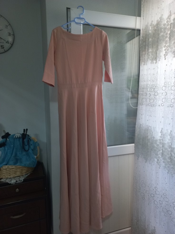Diger markasının bej uzun elbisesi, bol kesim ve drapeli detaylara sahip. Kayık yaka ve kısa kolludur, minimalist tarzda, düğünler için uygundur.