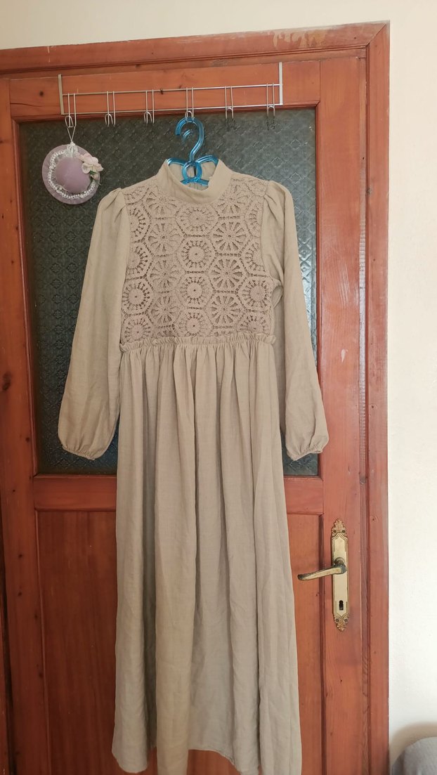 Diger markasının bej keten uzun elbisesi, yüksek yakalı, uzun kollu ve nakışlı dantel detaylı, bol kesim bohem tarzda bir tasarımdır çok az kullanıldı 2 defa anca.