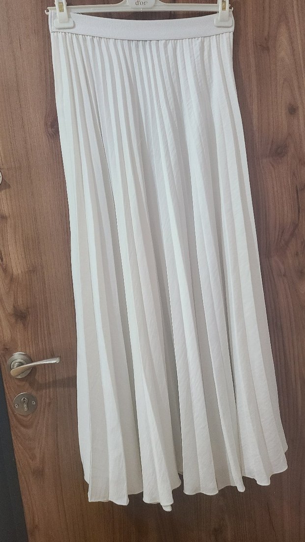 Diger markasının beyaz, bohem tarzda, desensiz uzun eteği, hafif ve akıcı bir görünüme sahiptir. tesettür Etek