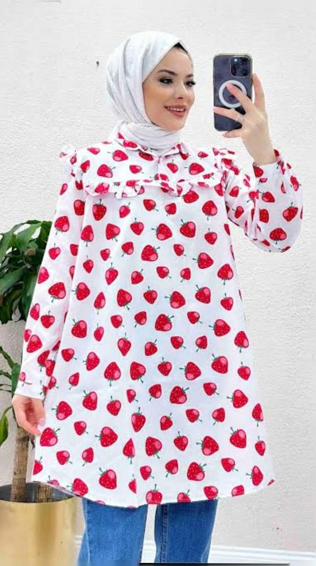 Diger marka, uzun kollu ve bol kesim gömlek Pamuk kumaş, çilek desenli ve fırfır detaylı, günlük kullanıma uygun.
