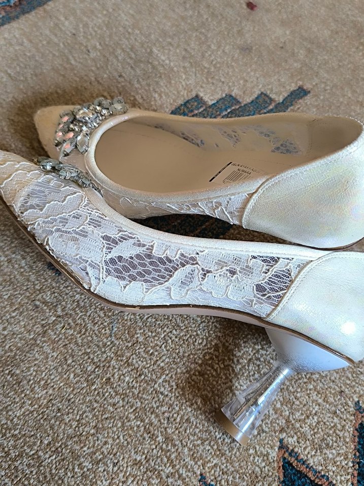 Diger markasının beyaz, dantel işlemeli ve ince topuklu kadın ayakkabısı. Sentetik kumaştan, düğünler için uygun klasik Paris esintili şıklık sunar.