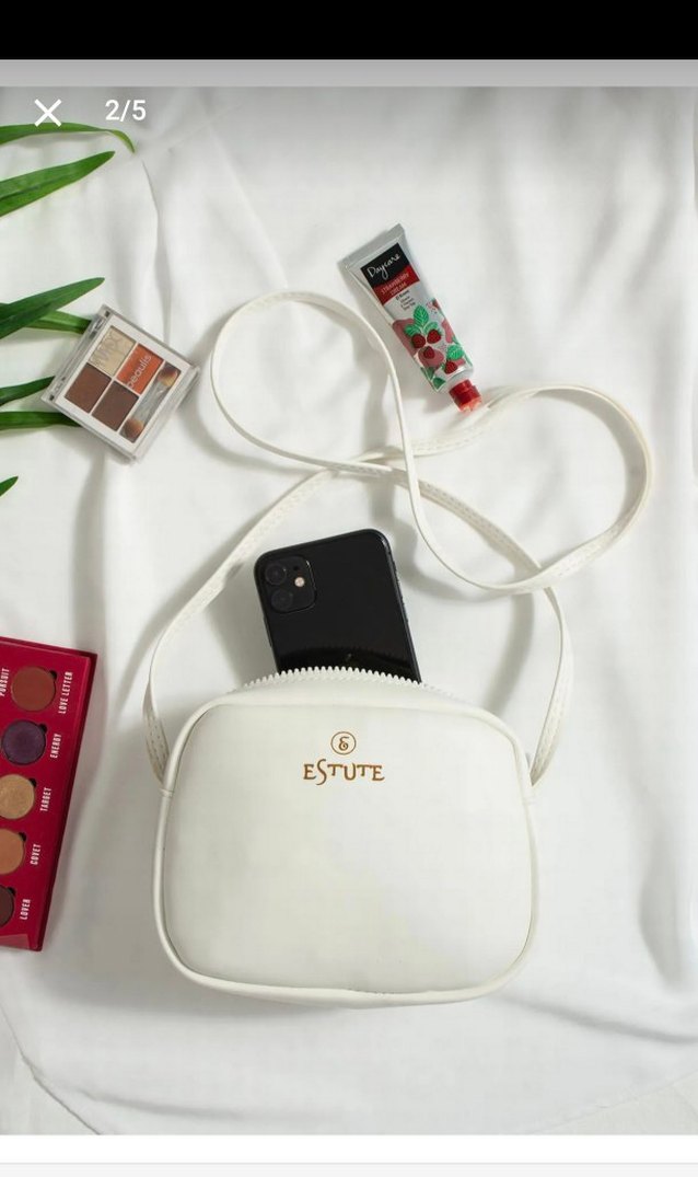 Diger markanın beyaz deri çapraz çantası, 'ESTUTE' yazılı baskı ve elastik detay içerir. Minimalist ve sokak stiline uygun, günlük kullanıma idealdir.