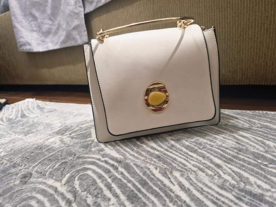 Diger markasına ait beyaz deri kadın çanta, tokalı kapama ve baskılı detaylara sahip. Modern klasik ve minimalist tarzda, günlük kullanıma uygun. çantayı 1 kez kullandım fakat dış kenarlarında hafif lekeler oluşmuş nasıl olduğu hakkında pek bilgim yok uzun omuz askısı mevcuttur