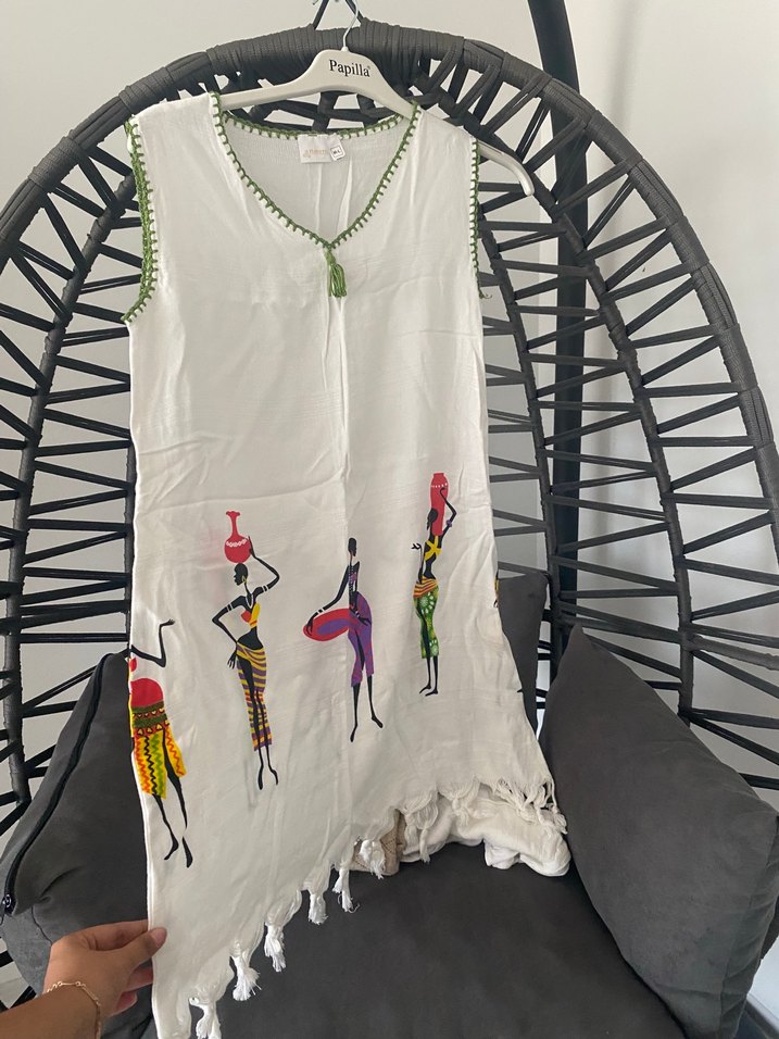 Kolsuz, uzun beyaz tunik, bol kesim ve etnik desenlerle. V yakalı, yeşil detaylı ve püsküllü bohem tarzda. M/L uyumlu, elbise olarak ya da sahilde kimono olarak kullanılabilir.
