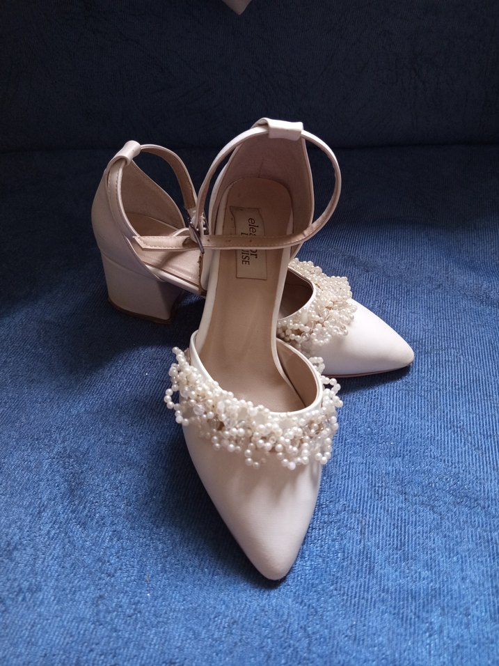 Diger markasına ait beyaz, inci işlemeli, dolgu topuklu kadın ayakkabısı. Lastik malzemeden üretilmiş, klasik zarafet için uygun düğün ayakkabısı.