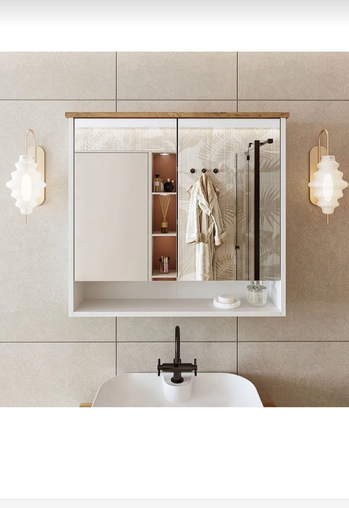 Diger beyaz ışıklı çerçeveli duvar aynası, yaprak desenli ve çoklu saklama bölmeleri ile banyonuzda şıklık ve fonksiyonellik sağlar.