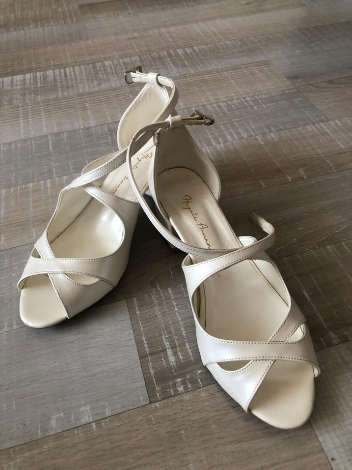 Hayati Arman markalı, çarpraz bantlı beyaz 5 cm topuklu kadın gelin ayakkabısı. Yumuşak kauçuk malzemeden, düğünler için uygun. sadece iki kere giyildi.