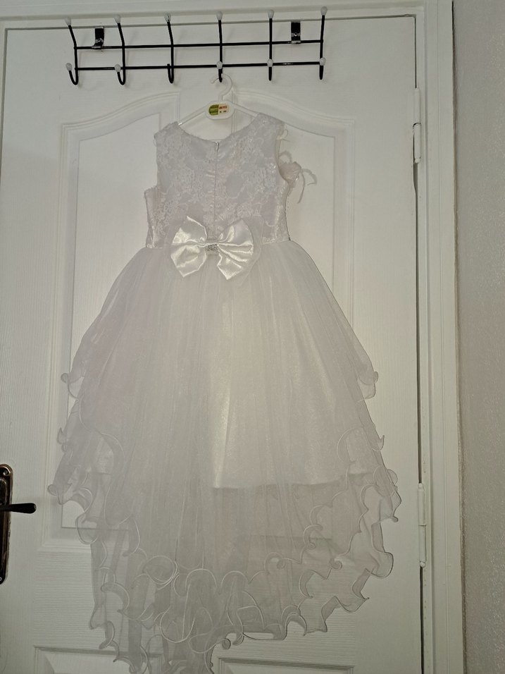 Kolsuz, V yakalı ve nakışlı detaylara sahip beyaz, klasik ve modern tarzda, fiyonk ve fırfır detaylı çocuk elbisesi.