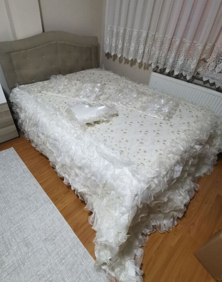 Diğer marka beyaz yatak örtüsü, parlak kumaş ve nakışlı desenlerle şıklık katıyor. ✨ yatak örtüsü iki kırlent bir adet kalp yastık