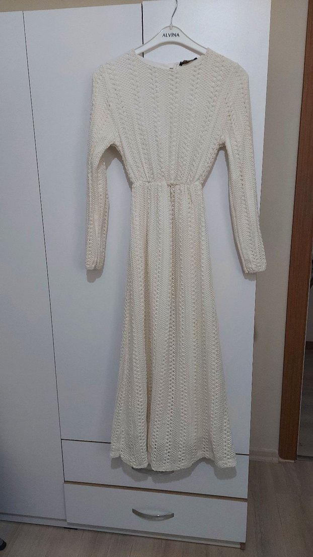 Beyaz renkli, örgü dokulu, bol kesim, uzun kollu bohem tarzda uzun elbise. Rahat ve günlük kullanıma uygun. Kalıbı dardır.