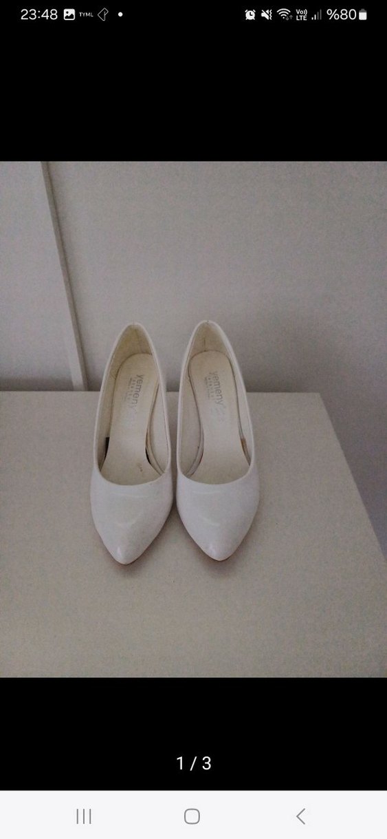 Diger markanın beyaz renkte, lastik malzemeden yapılmış stiletto topuklu kadın ayakkabısı. Modern klasik stilde, düğün ve minimalist kombinler için rahat ve şık.
