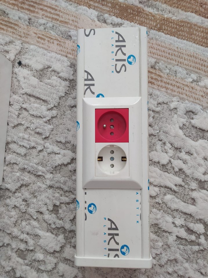 İki priz yuvası bulunan beyaz telefon şarj adaptörü, kırmızı bir prizle birlikte. Ambalajda AKIS logosu yer alıyor. toplu fiyat