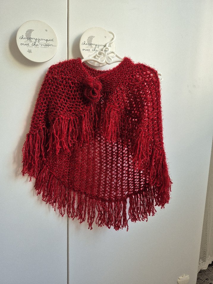 Diger markasının bordo renkli, örgü kız pelerini, bol kesim, askılı kollu ve yuvarlak yakalıdır. Bohem tarzıyla püskül detayları taşır. 1 yastan 4 yaşa kadar kullanılabilir