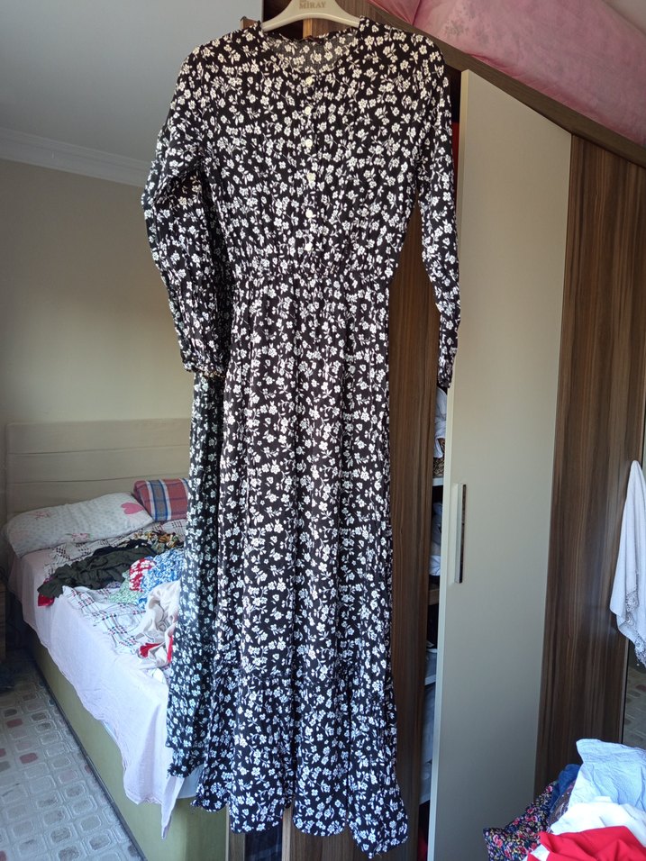 Diger markanın pamuk kumaştan, uzun kollu, V yakalı, bol kesim, drapeli, koyu renkli çiçekli bohem tarz uzun elbisesi.