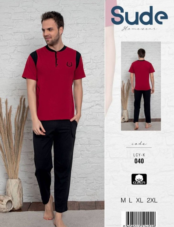 Diger markasının bordo kısa kollu, bisiklet yaka ve baskılı detaylı üstü ile siyah pantolondan oluşan erkek pijama takımı. Regular fit ve midi boy rahatlık sağlar.