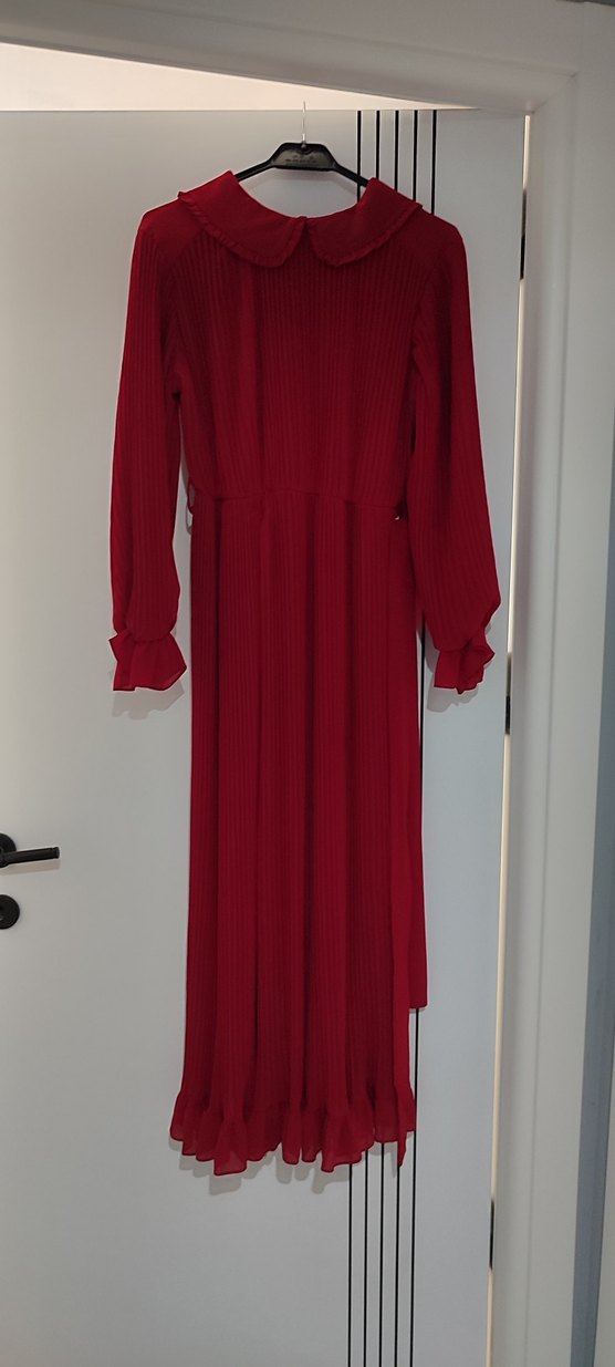 Diger marka bordo uzun elbise, yüksek yaka, piliseli yapıya ve uzun kollarında fırfır detayına sahip, klasik şıklık için ideal.