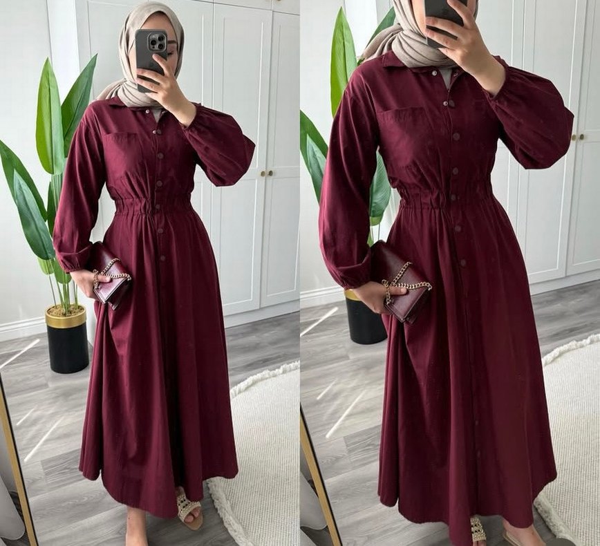 Diger markasının bordo uzun elbisesi, düğmeli ön kısmı ve yakasıyla bol kesimdir. İpek gibi dokusuyla günlük kullanıma uygun, sade ve bohem tarzda bir üründür.