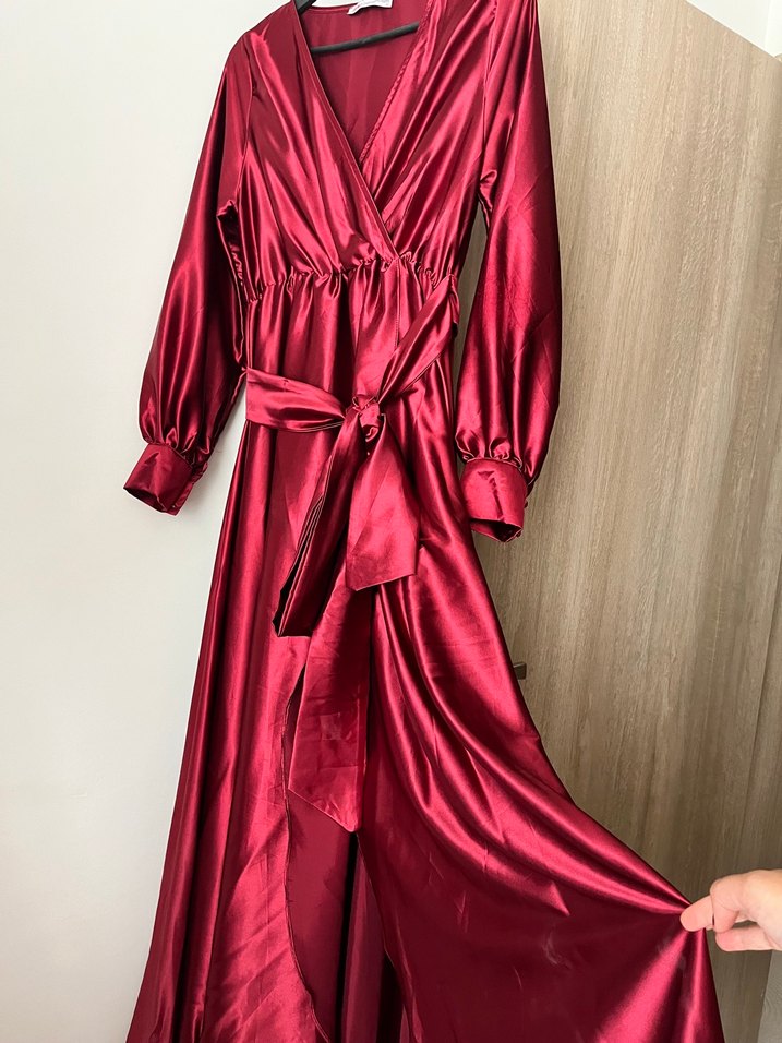Diger marka bordo uzun saten elbise, sarkan ve bol kesimli tasarımıyla dikkat çeker. V yaka ve uzun kolludur, parlak kumaşıyla romantik akşamlar için uygundur. ✨