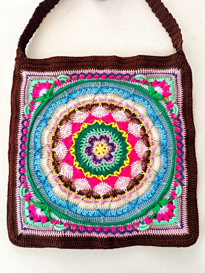 Renkli örgü ve mandala desenli bohem tarzda günlük kullanıma uygun kadın çantası.