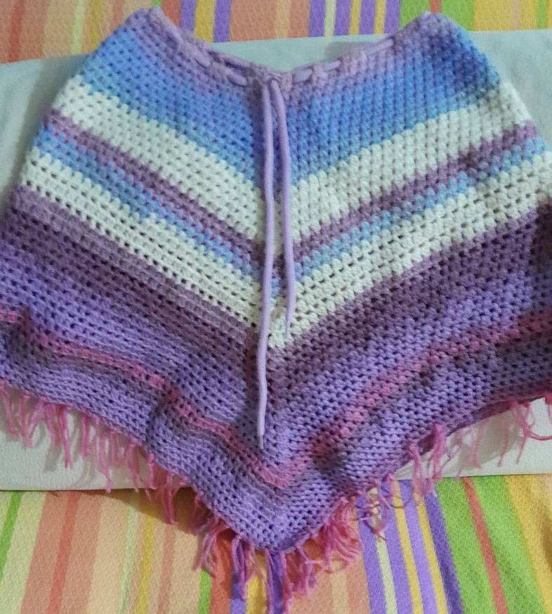 Diger markanın bol kesim, tekne yaka ve askılı kollu kız pançosu, örgü kumaştan yapılmıştır. Pastel tonlarda tie-dye desen ve püskül detaylarıyla bohem tarzı sunar.