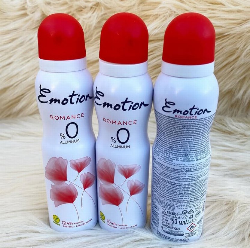 Diger Emotion Romance kadın deodorant, %0 alüminyum içerir ve 48 saat koruma sağlar. 150 ml sprey şişede, çiçeksi kokuludur.