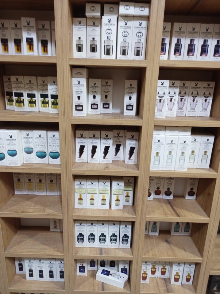 Diger markasına ait farklı kokularda ve formüllerde erkek cilt bakım ürünleri düzenli ahşap raflarda sergilenmektedir.