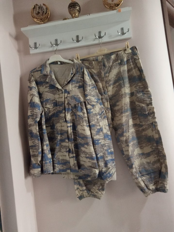 Gri tonlarında kamuflaj desenli, uzun kollu, yakalı ve kemerli bol kesim erkek pijama takımı, streetwear tarzında. görüldüğü gibi