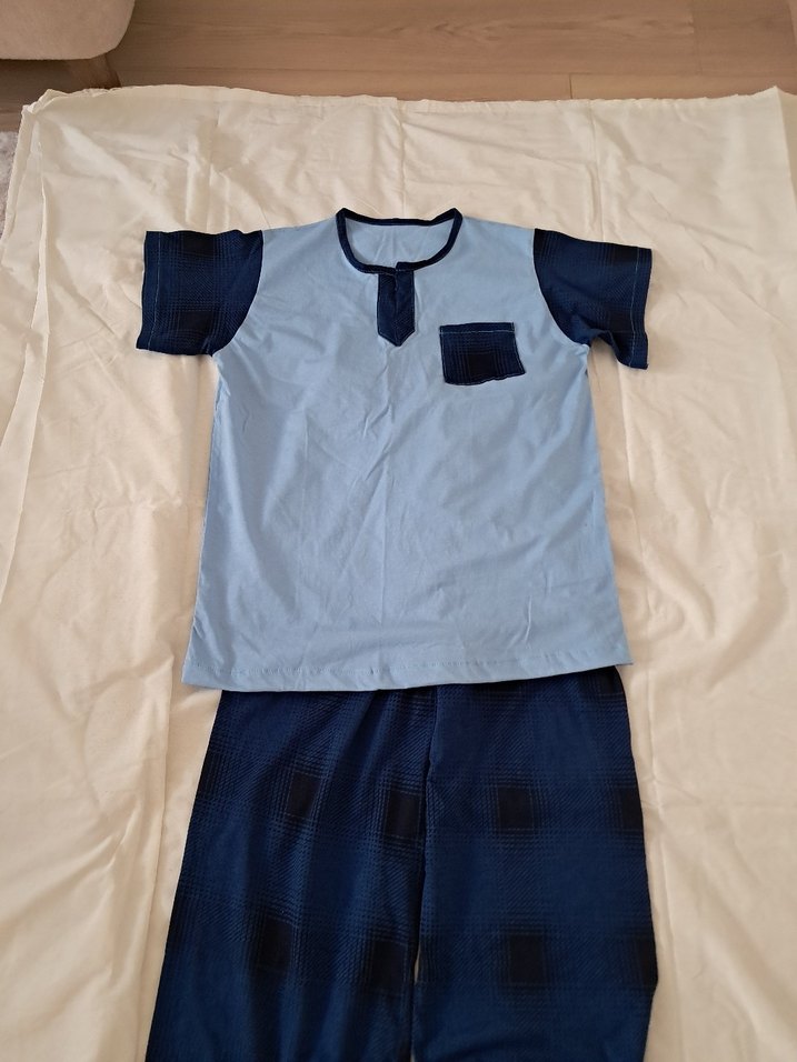 Diger marka erkek pijama takımı, kısa kollu ve bisiklet yaka, rahat kesim ve cep detaylı sade mavi tasarım.