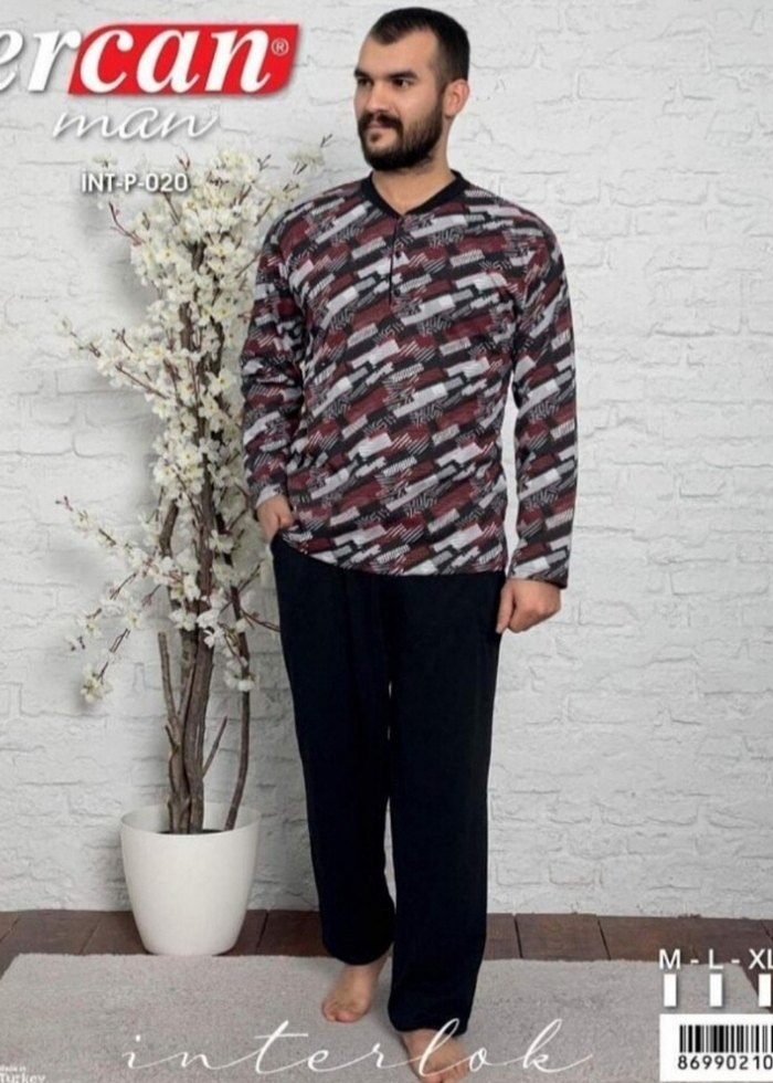 Diger marka, gri batik desenli erkek pijama takımıdır. Uzun kollu, yuvarlak yaka ve kemerli tasarıma sahiptir. Rahat ve bol kesimdir, midi boyda üretilmiştir.