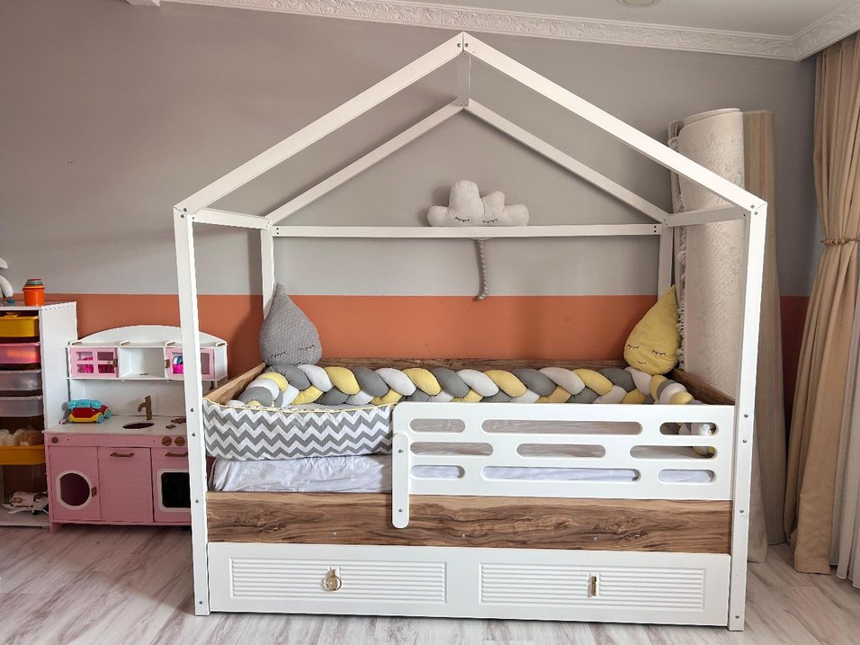 Diger marka gri çocuk yatağı, ev şeklinde çerçeve ve alt kısmında saklama çekmeceleri içerir. Yumuşak örgü koruyucular rahatlık ve güvenlik sağlar. ️