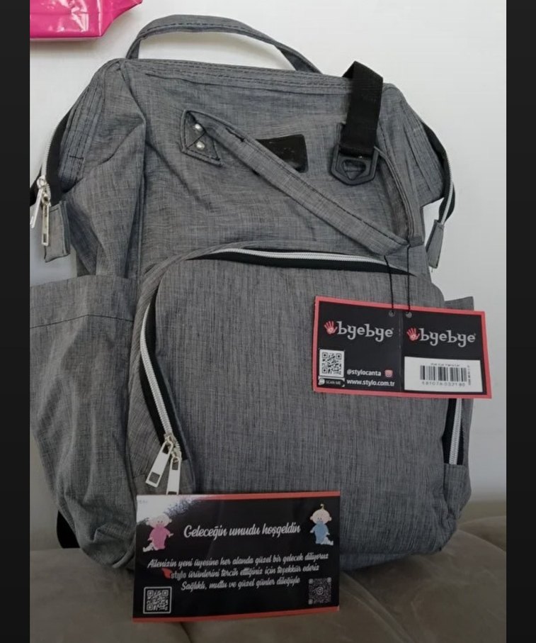 Diger markanın gri renkli, desenli bebek çantası. Çok bölmeli ve kullanışlı yapıya sahip. Üzerinde "Wbyebye" yazısı bulunur. KUSURSUZ kenarda duruyo sıfır ayarında trendyoldan almıştım şuan ki fiyatı 800 civarında aşırı kaliteli alan pişman olmaz