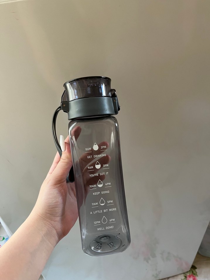 Zaman işaretli, kapaklı ve taşıma kayışlı gri Diger suluk şişesi. Su takibini kolaylaştırır.